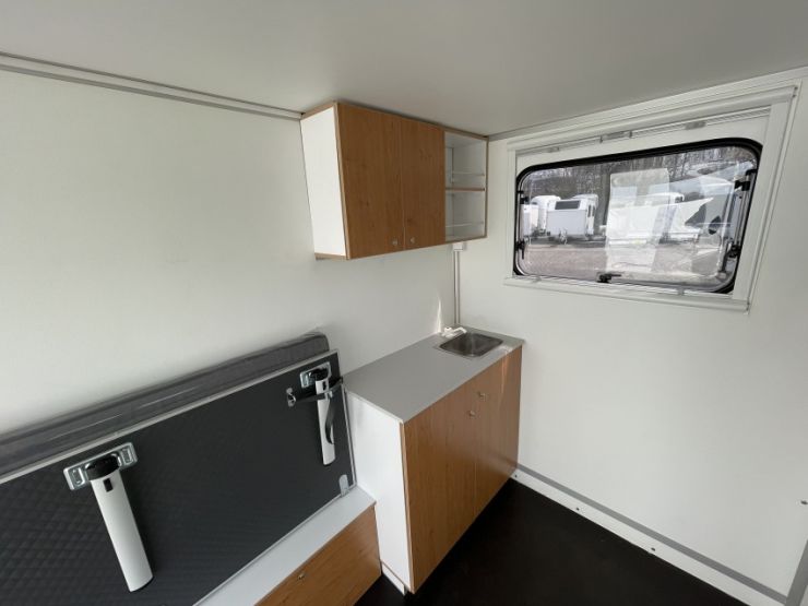 W przedniej części przyczepy znaleźć moĹĽna typowe wyposaĹĽenie dla przyczep kempingowych : kuchnia wyposaĹĽona w zlew i pĹ‚ytÄ™ gazowÄ…, skĹ‚adane Ĺ‚óĹĽko, stolik.