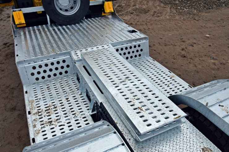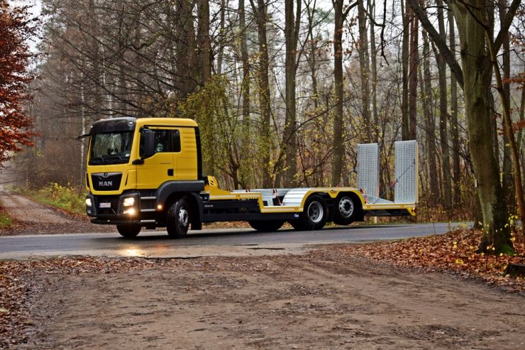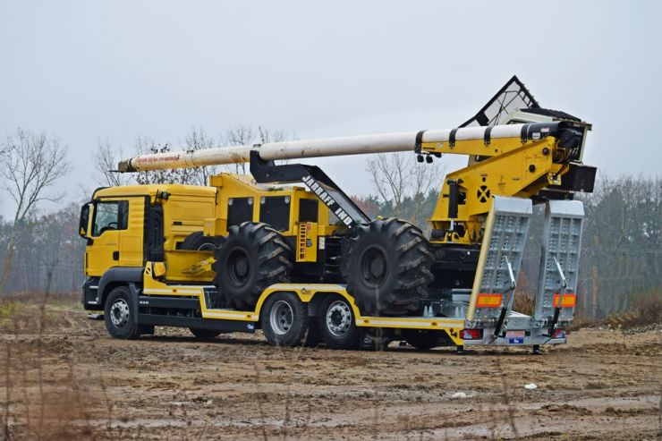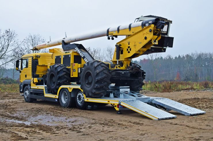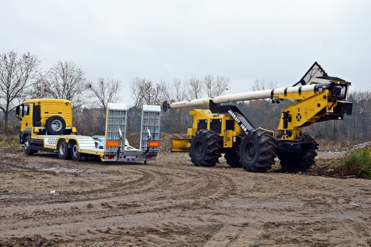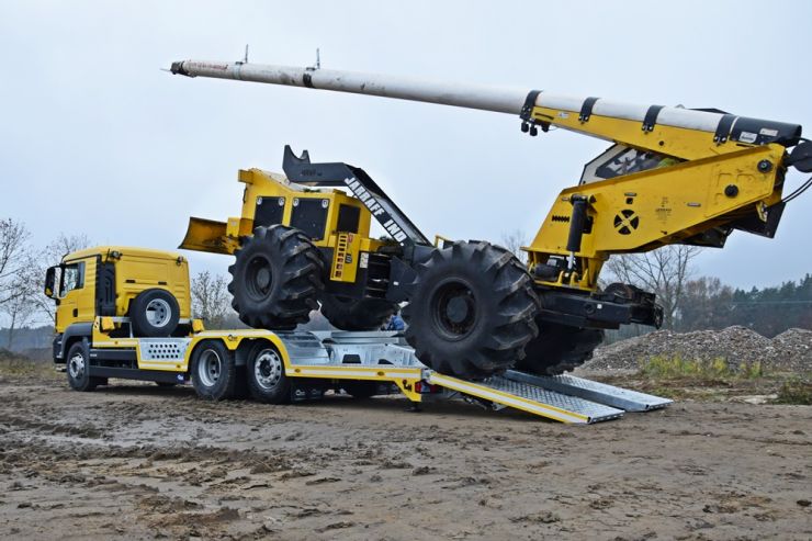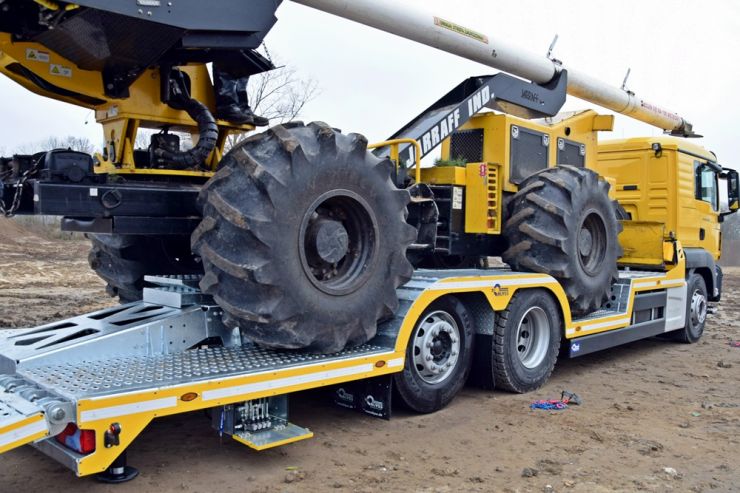 W naszej ofercie pojawiĹa siÄ specjalistyczna zabudowa staĹa sĹuĹźÄ ca do transportu maszyny Jarrraff - 11 tonowego trymera do obcinania gaĹÄzi drzew na wysokoĹci. Platforma zabudowy o wymiarach 8050x2550 mm wykonana z blachy perforowanej o gruboĹci 4 mm. Zabudowa zaprojektowana zostaĹa pod rozmiar kóĹ i rozstaw osi maszyny Jarraff. Dodatkowe najazdy umoĹźliwiajÄ regulacjÄ wysokoĹci zaĹadunkowej dziÄki czemu platforma równieĹź sprawdzi siÄ w transporcie innych maszyn budowlanych, leĹnych czy teĹź ciÄ gników rolniczych. Bezpieczny zaĹadunek i rozĹadunek prawie 11 tonowej maszyny uĹatwiajÄ dwie hydraulicznie wysuwane podpory, umieszczone pod tylnym zwisem. Hydraulika obsĹuguje równieĹź unoszenie i opuszczanie najazdów, a zasilanie pompy odbywa siÄ oczywiĹcie przez przystawkÄ mocy w ciÄĹźarówce.