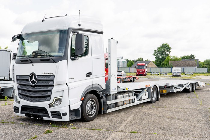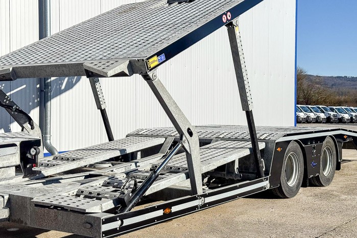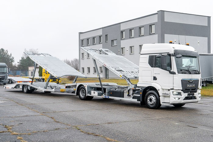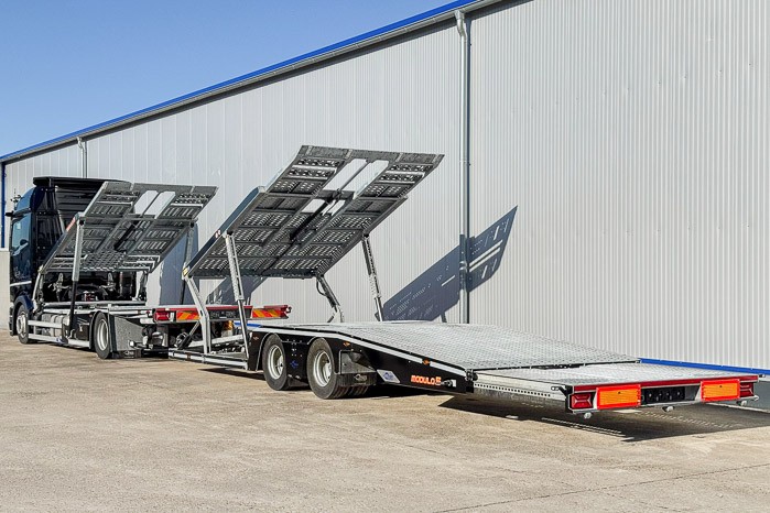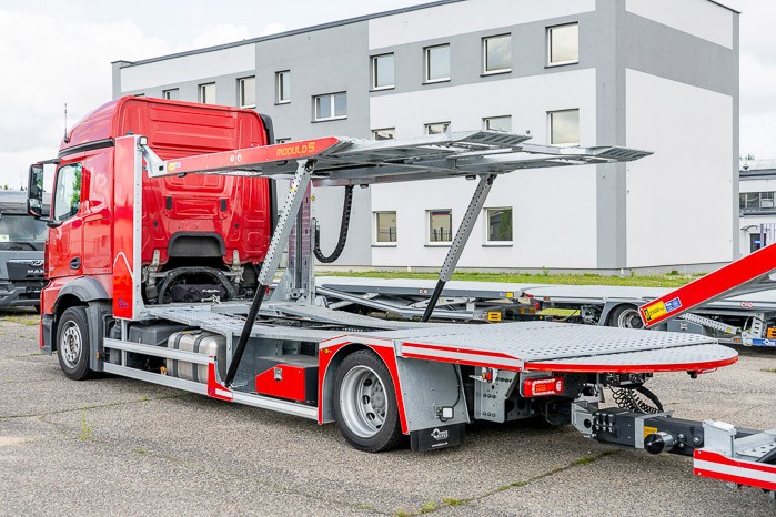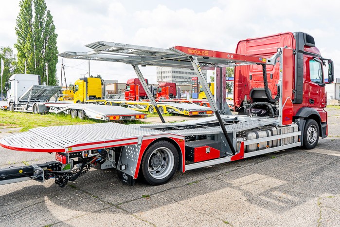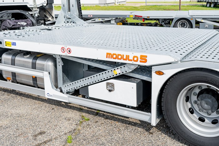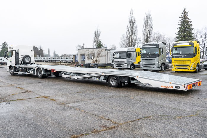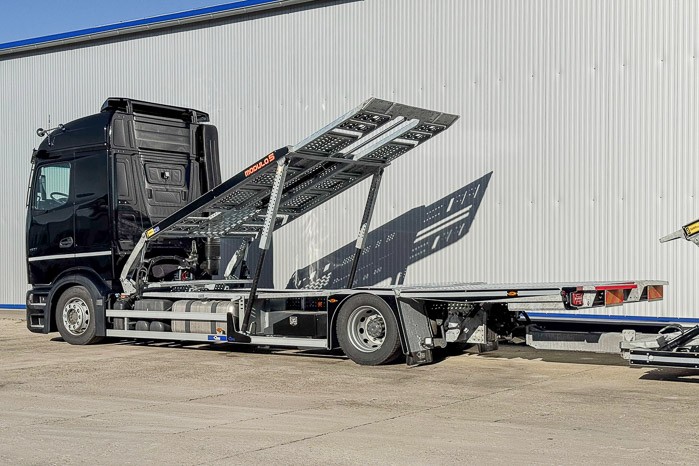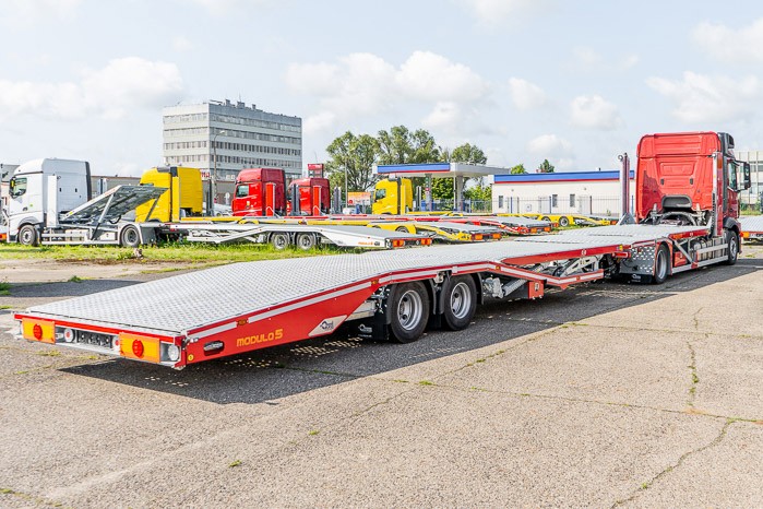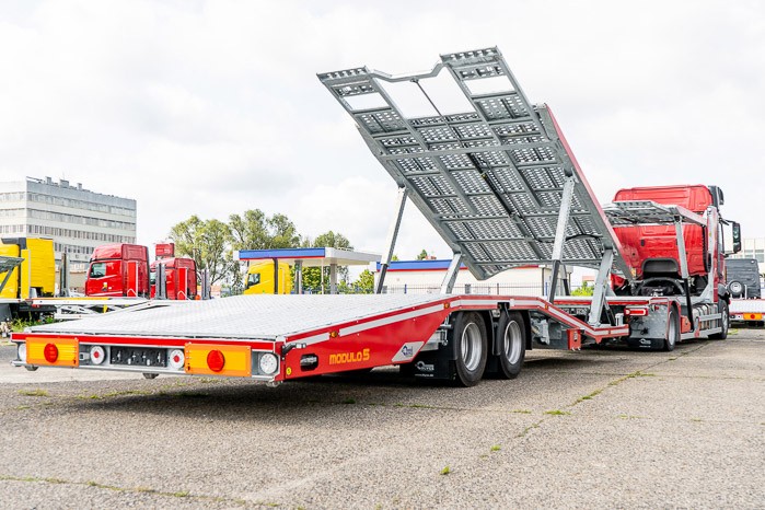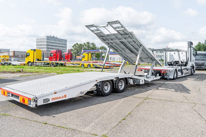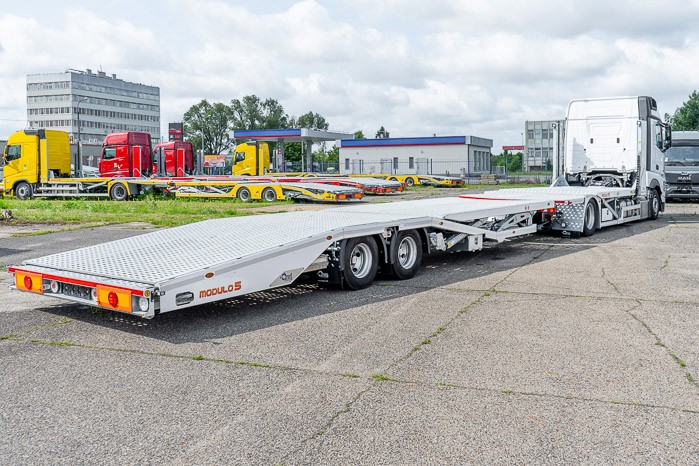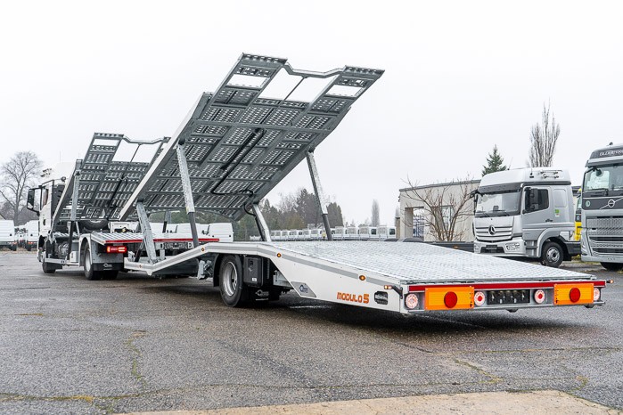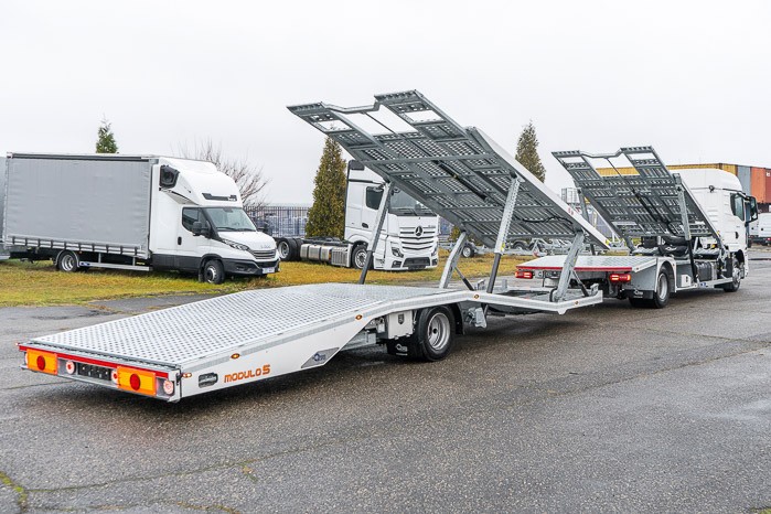 Autotransporter Modulo 5 przeznaczony do przewozu pięciu samochodów osobowych lub czterech dostawczych w dowolnej konfiguracji. Multifunkcyjna zabudowa z przyczep± pneumatyczn± z możliwo¶ci± bezpo¶redniego przejazdu z platformy przyczepy na platformę pojazdu to doskonała odpowiedĽ na potrzeby firm transportowych.