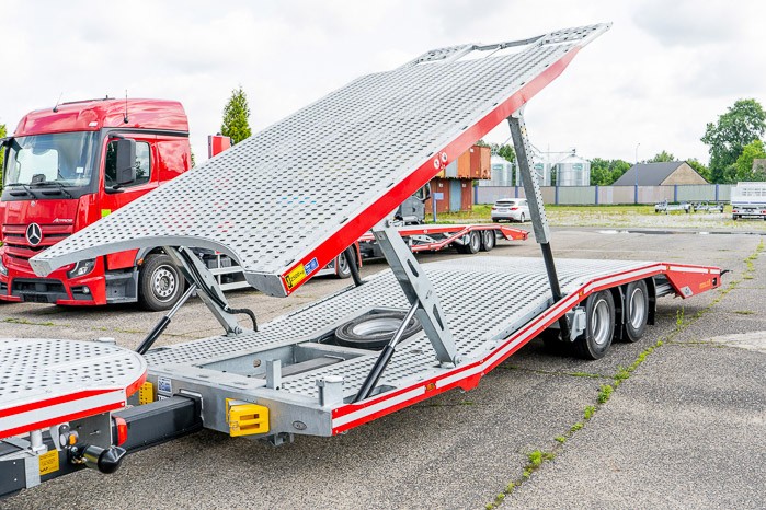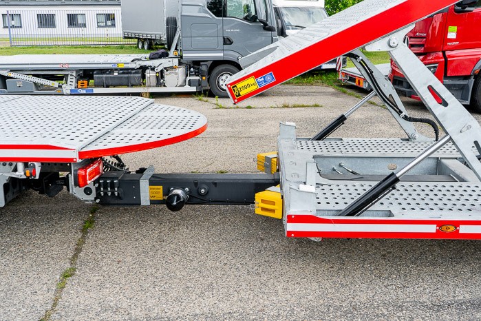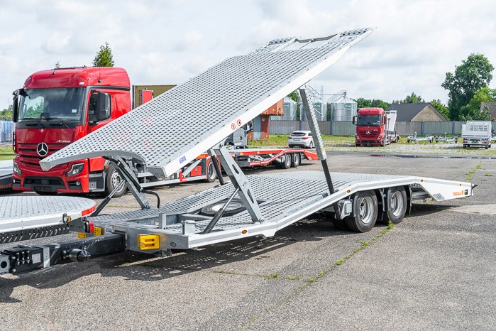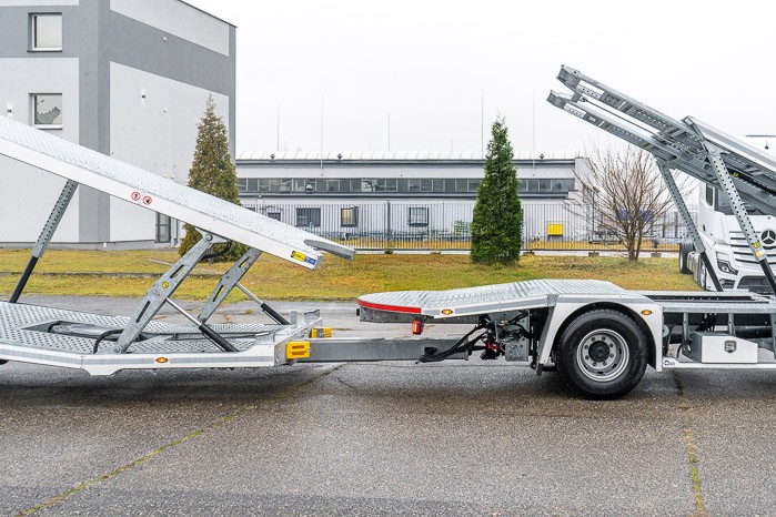 Rama zabudowy wykonana z wysokiej jako¶ci stali cynkowanej ogniowo. Platforma poszyta stalow± blach± otworowan± pozwala na odpowiednie zabezpieczenie ładunku oraz zwiększa przyczepno¶ć pojazdów najeżdżaj±cych. Hydraulicznie wysuwana szuflada w przyczepie umożliwia zwiększenie przestrzeni ładunkowej oraz zmniejsza k±t najazdu. Opcjonalne zastosowanie uchylnej hydraulicznie platformy zasadniczej nie wymaga rozpinania przyczepy do załadunku pojazdu.