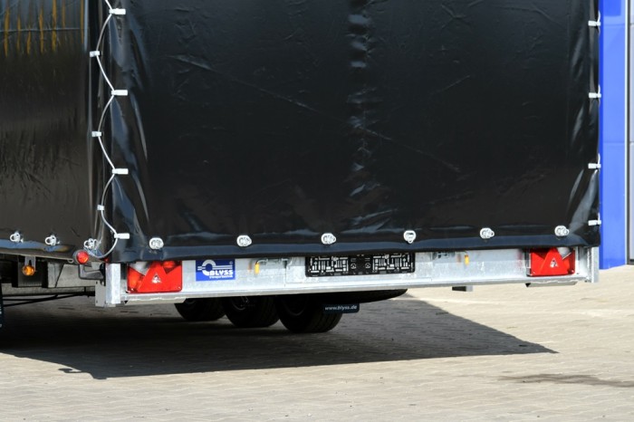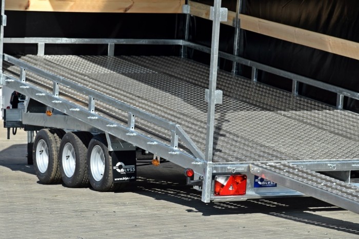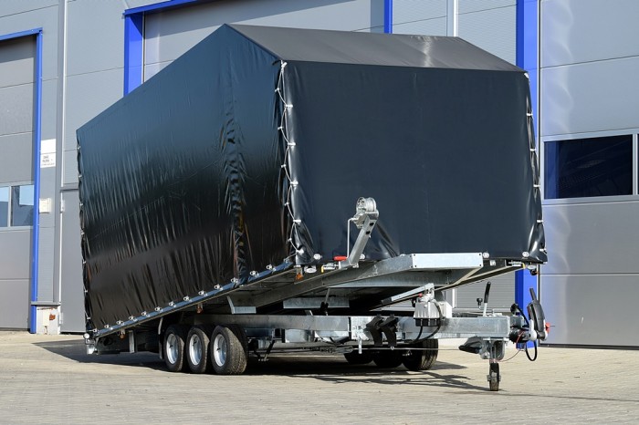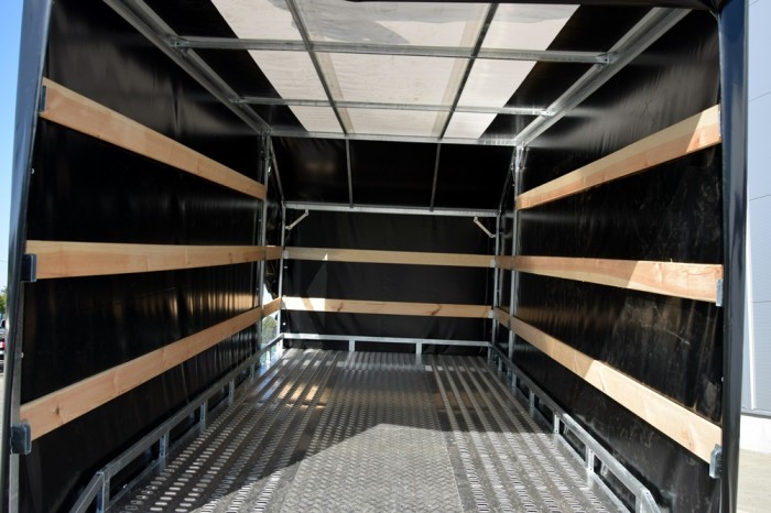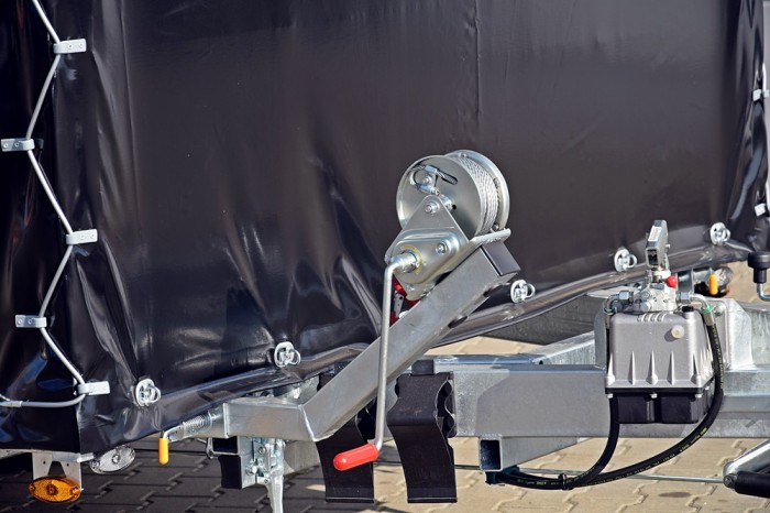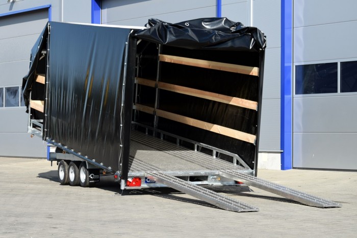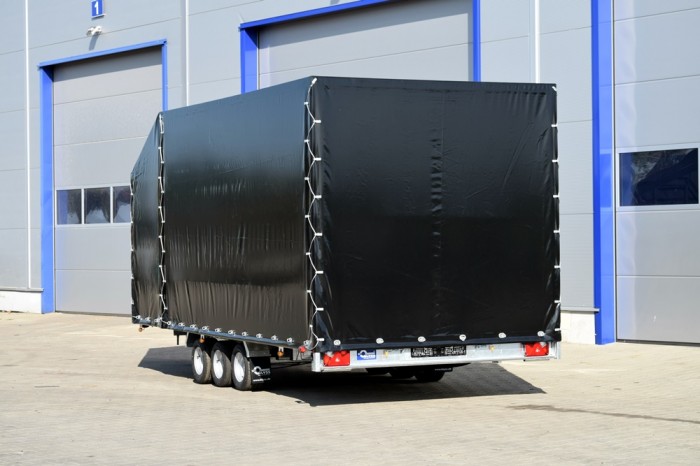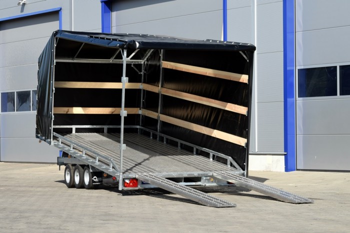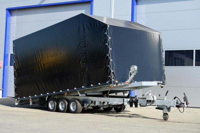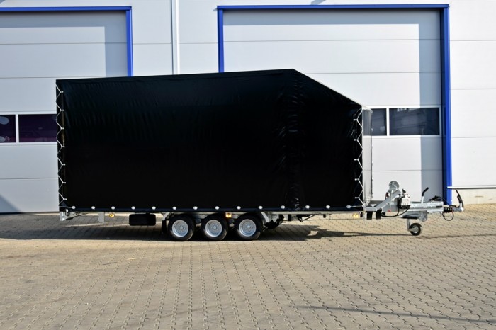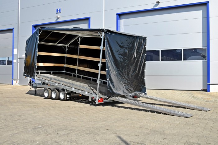 LIFTER 3550 3 OSIE Z PLANDEKĄ to wytrzymała, trzyosiowa laweta samochodowa z uchylną platformą, idealna do transportu różnorodnych ładunków wymagających ochrony przed warunkami atmosferycznymi. Solidna stalowa rama, cynkowana ogniowo, zapewnia długotrwałą odporność na korozję, a przestrzeń ładunkowa wykonana z otworowanej blachy lohr i wypełniona blachą ryflowaną zapewnia doskonałą przyczepność oraz bezpieczeństwo przewożonego towaru. Plandeka o wysokości 215 cm daje dodatkową ochronę i bezpieczeństwo, co czyni tę przyczepę idealnym wyborem do profesjonalnego użytku.