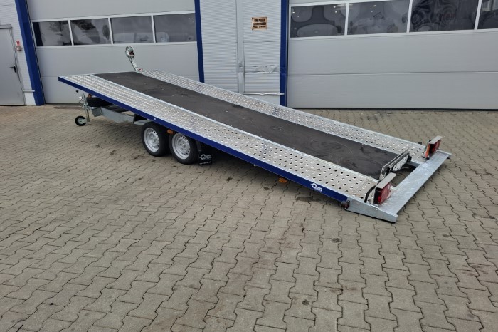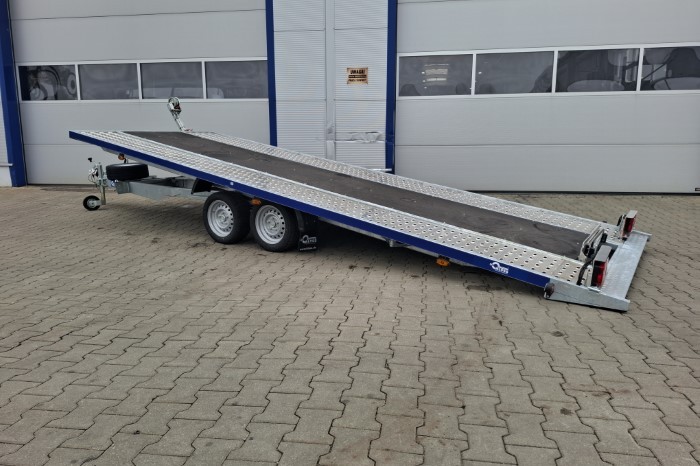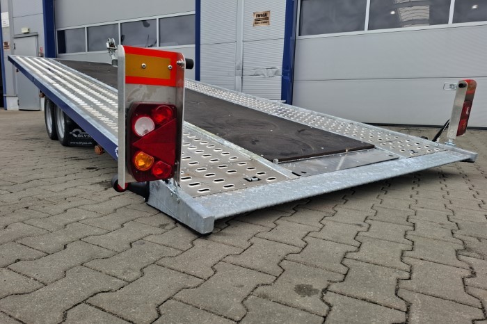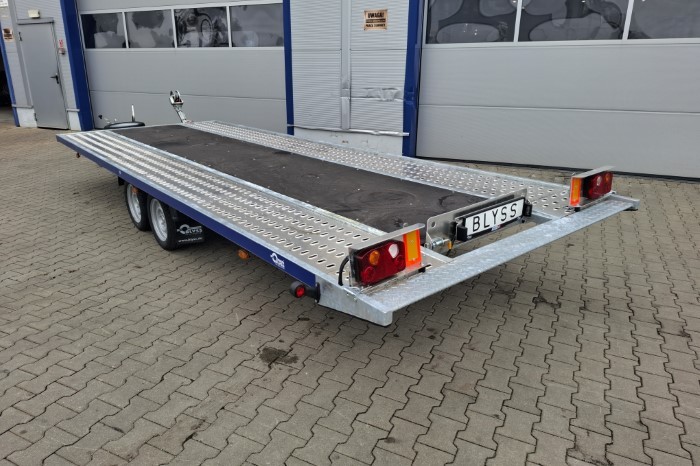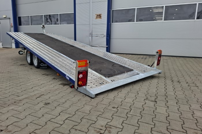 Delta 355521SK to wytrzymała i funkcjonalna laweta uchylna, zaprojektowana z myślą o profesjonalnym transporcie pojazdów i maszyn. Posiada solidną platformę o wymiarach 550 x 210 cm wykonaną ze sklejki antypoślizgowej oraz dopuszczalną masę całkowitą 3500 kg. Ładowność na poziomie 2560 kg pozwala na bezpieczne przewożenie nawet cięższych aut. Całość osadzona jest na dwóch osiach o nośności 1800 kg każda, z dodatkowymi amortyzatorami, które poprawiają komfort i stabilność jazdy.