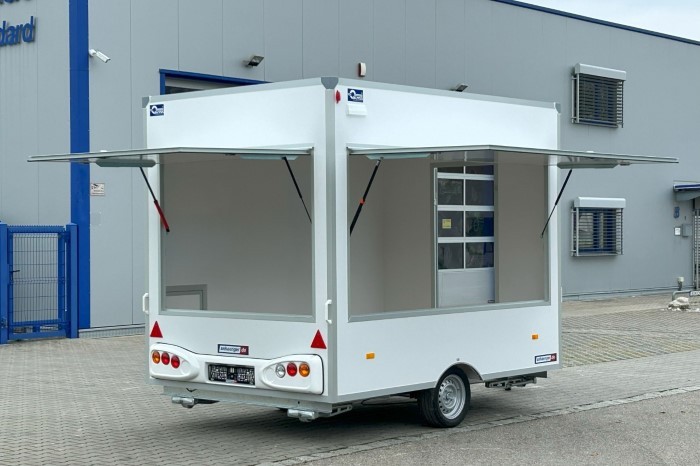Model H13302HL wyróżnia się dwiema klapami sprzedażowymi – boczną i tylną, co znacząco zwiększa możliwości obsługi klientów i elastyczność ustawienia stoiska. Solidna rama cynkowana ogniowo, izolowane ściany typu sandwich oraz trwała podłoga pokryta wykładziną PCV gwarantują długą żywotność i komfort użytkowania. To praktyczna przyczepa handlowa dla przedsiębiorców, którzy szukają niezawodnego i dobrze widocznego rozwiązania pod handel mobilny.