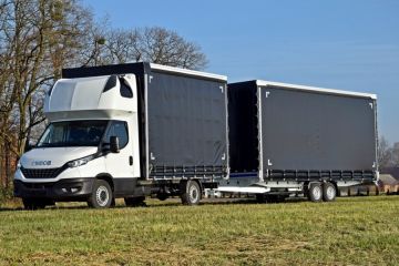 Dodatkowe opcje, takie jak winda towarowa, dwuspadowy dach, przesuwne drzwi tylne oraz osłony antyrowerowe, pozwalają dostosować zabudowę do konkretnych potrzeb i wymagań użytkownika. Oświetlenie zgodne z przepisami o ruchu drogowym oraz punkt świetlny LED w przestrzeni ładunkowej zapewniają odpowiednią widoczność w trakcie transportu.